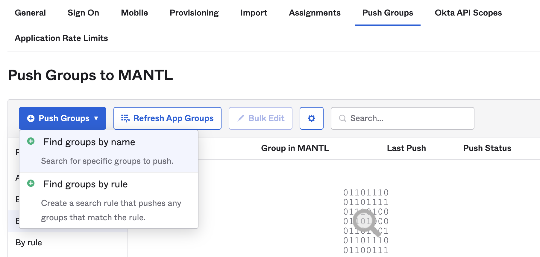 - Create roles in the MANTL Console by using the Push Groups tab, then finding groups by name or rule. It's important to push groups before assignment (step 11.)