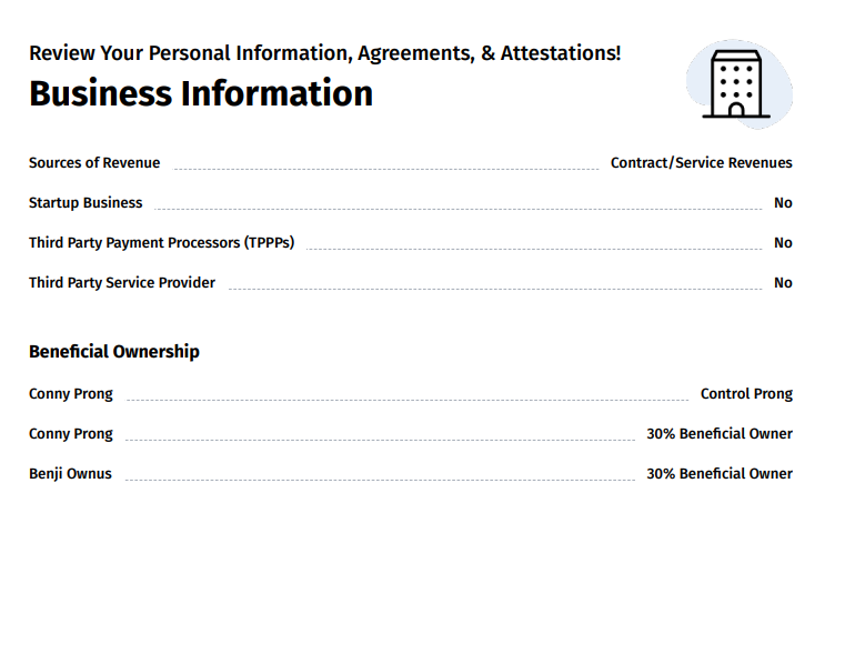 Update to the Business Application Review & Sign page to show all beneficial ownership information. For beneficial owners who are not the current applicant, the page will only display Name, Title, Organization Role, and Percentage Owned (if an owner). This does not show the last 4 of the SSN or other details like DOB, Residency Status, or Address.