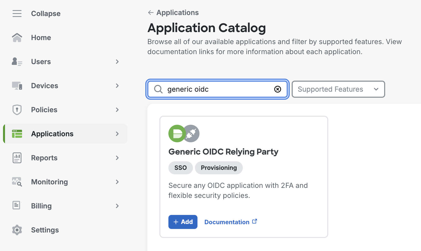 - Duo doesn't provide an application with only provisioning, even if you plan on only using user-provisioning, without SSO, you'll add this application and simply not enable the OIDC feature.