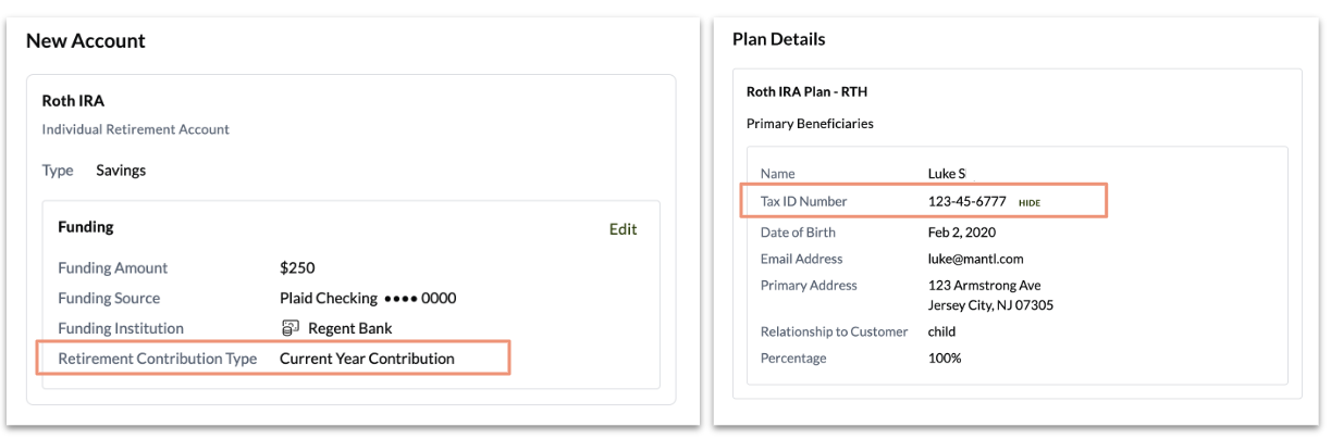 | APP-2599 | For retirement account applications, the funding transaction code will be displayed on the review and sign page if applicable, and the primary owner will be able to view the tax ids for beneficiaries on the review and sign page. |