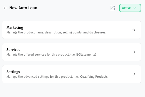 Loan products viewed in the Digital Branch Manager will now only have the Marketing, Services, and Settings. Rates and Deposit Methods have been hidden as they are not used for loans.