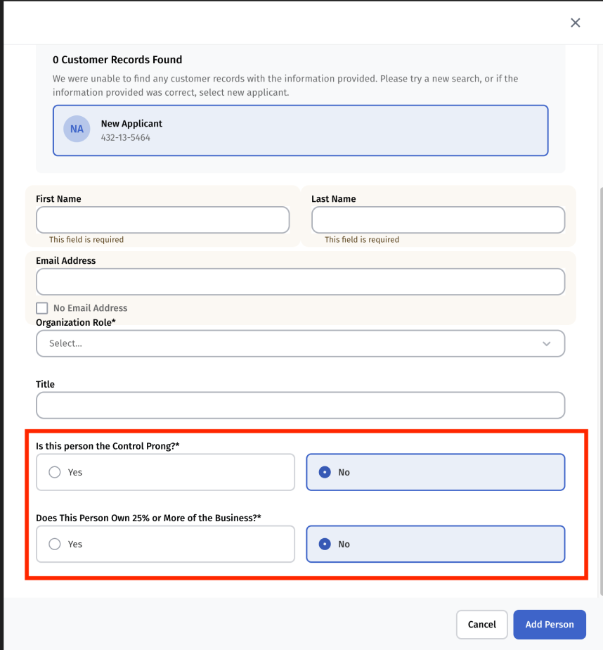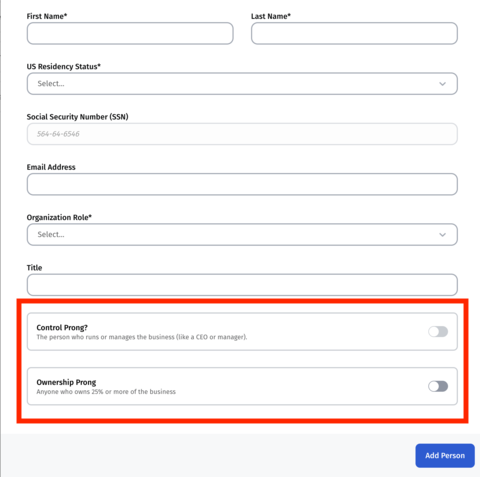 The Control Prong and Ownership Prong fields now use toggle switches to make the form more intuitive. This visual improvement enhances consistency across the platform and streamlines the process of identifying key business individuals.