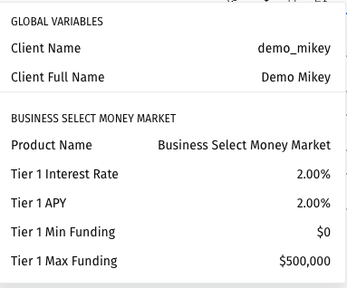 • New support for both Interest Rate and APY variables in the Marketing section of a product • Financial Institutions can update rates directly in DBM and have changes reflected dynamically in the digital experience • Improved clarity for APY configuration: The variable label previously shown as “Rate” has been updated to “APY” to clearly distinguish it from Interest Rate